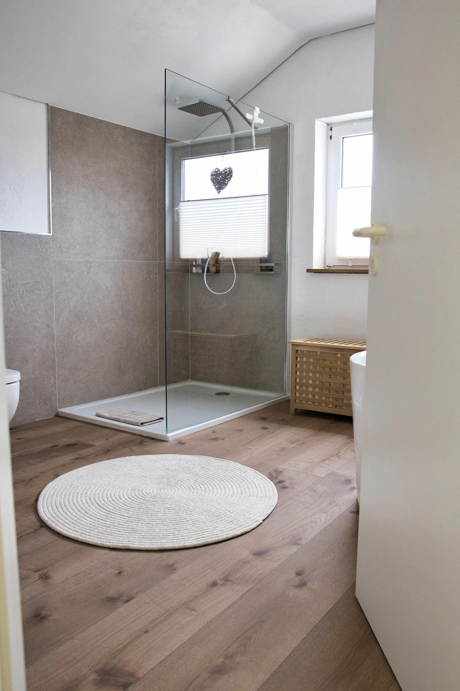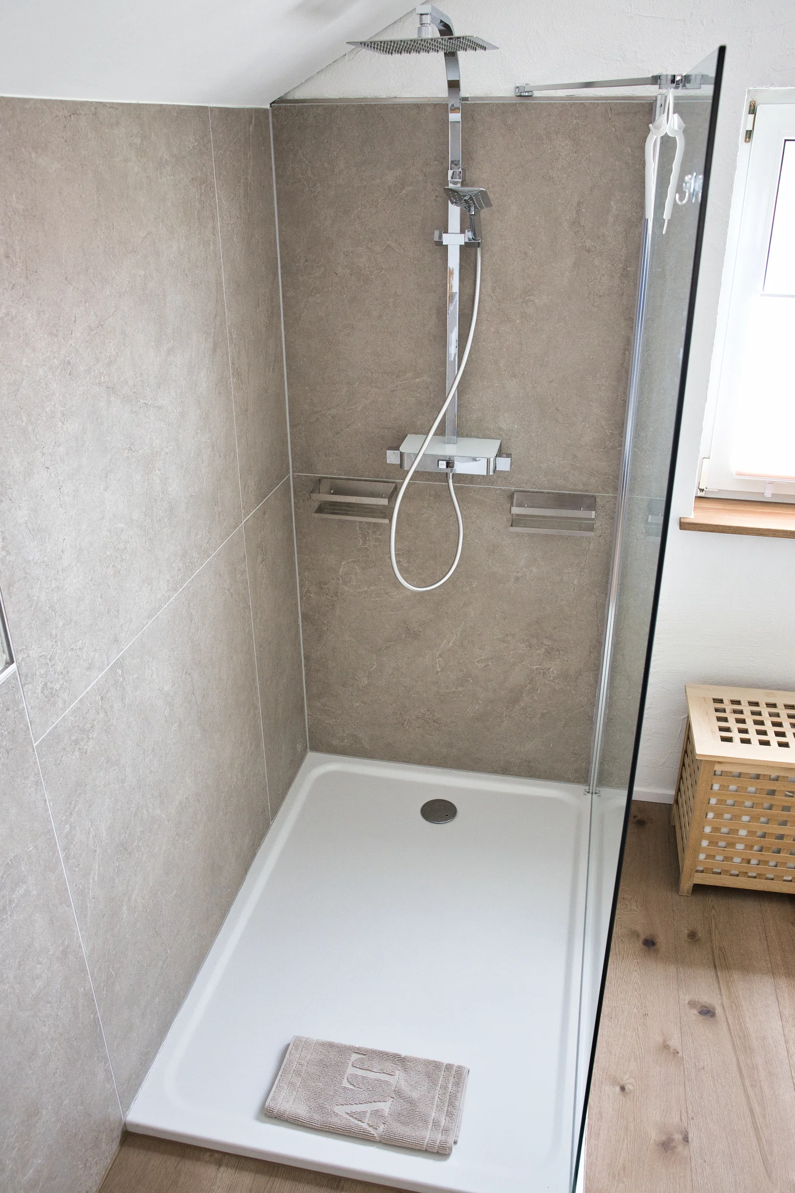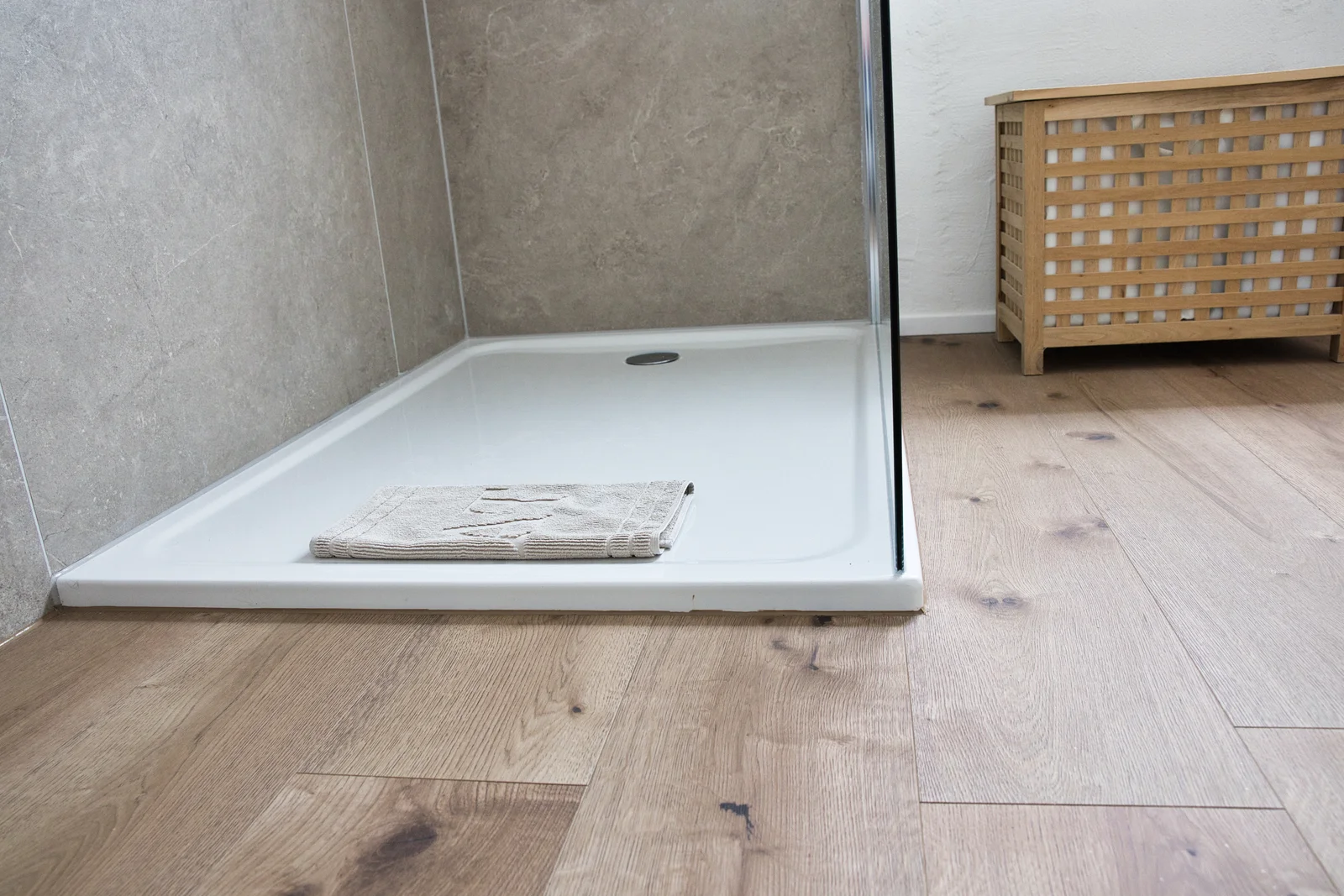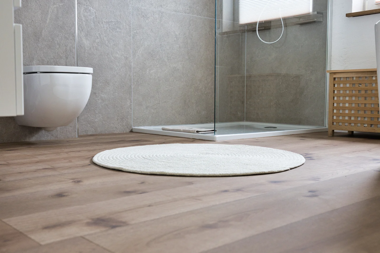 Für dieses Badezimmer in Landstuhl kamen moderne Materialien aus unserem Sortiment zum Einsatz. Der Boden wurde mit einem robusten Vinyl in Holzoptik gestaltet, das nicht nur pflegeleicht ist, sondern auch für ein angenehmes Laufgefühl sorgt.