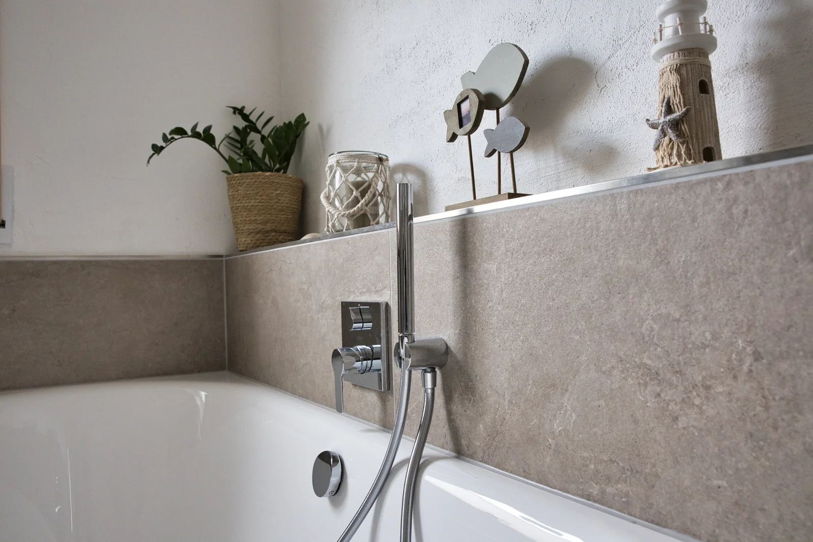 Teilbereiche der Wände wurden mit stilvollen Fliesen versehen, die dem Raum Struktur und Eleganz verleihen. Eine bodengleiche Dusche, eine großzügige Badewanne sowie formschöne Armaturen runden das moderne Gestaltungskonzept ab.
